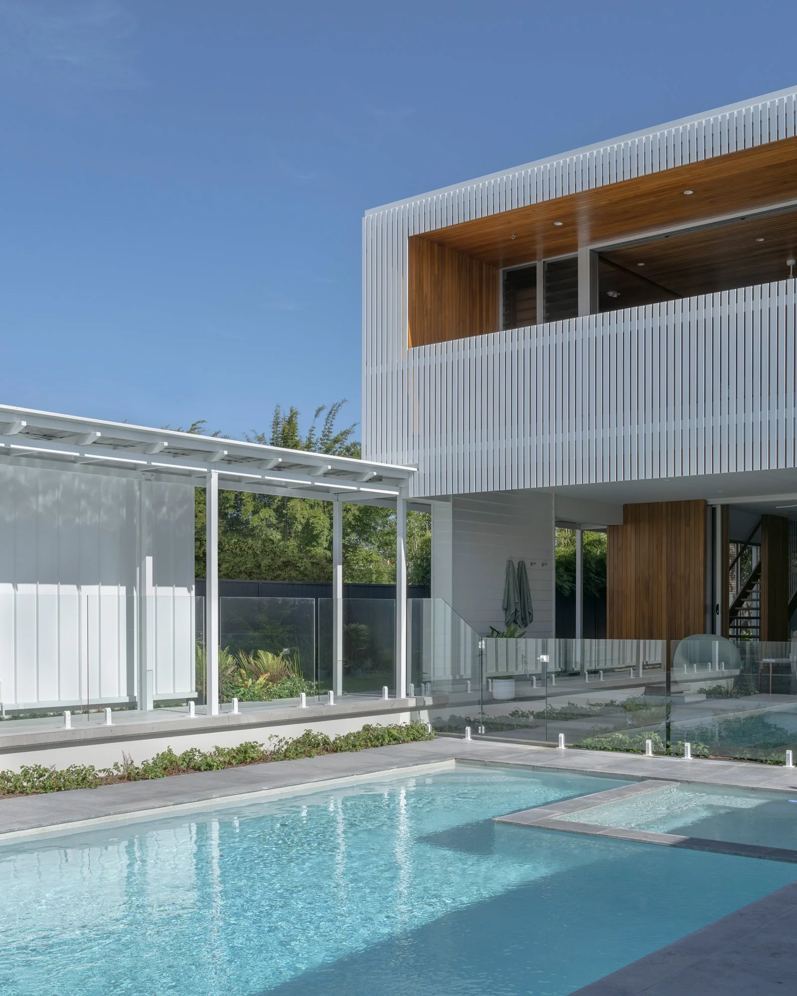 Idyllically located in a Sunshine Coast hamlet wedged between nature reserves, Currimundi Lake and the surf beach, Veil + Co. House is a multigenerational co-living coastal residence. With an atypical entry and a deeply setback main dwelling, the project reinterprets traditional Queensland housing for contemporary living, showcasing flexible accommodation and high levels of privacy.